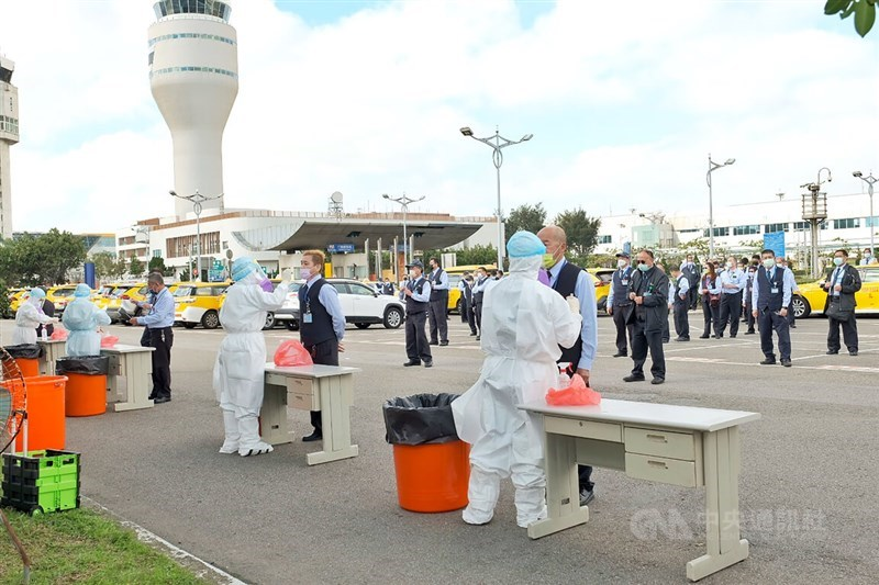 桃機群聚案截至6日中午已有8人確診,其中檢出“奧密克戎”個案從2例增為4例。圖為桃機防疫出租車司機接受篩檢。