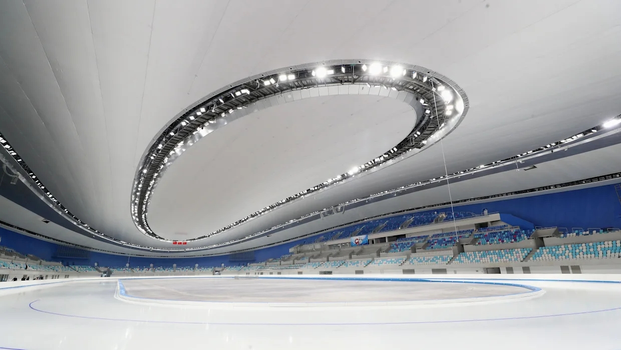 國家速滑館又稱“冰絲帶”,是本屆賽事唯一新建冰上競賽場館,與“鳥巢”、“水立方”共同組成“雙奧”之城的標志性建筑群?!氨z帶”是冬奧歷史上第一個使用二氧化碳作為制冷劑的速滑場館,將承擔速度滑冰項目的比賽,產(chǎn)生14塊金牌,是冬奧會產(chǎn)生金牌數(shù)量最多的單個場館。