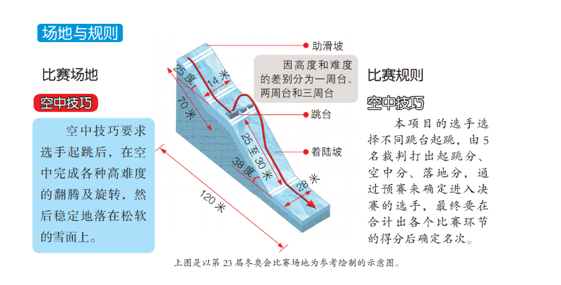 自由式滑雪項(xiàng)目包括空中技巧、雪上技巧、U型場地技巧、坡面障礙技巧、障礙追逐和大跳臺(tái)等小項(xiàng),不同小項(xiàng)各具特色。
