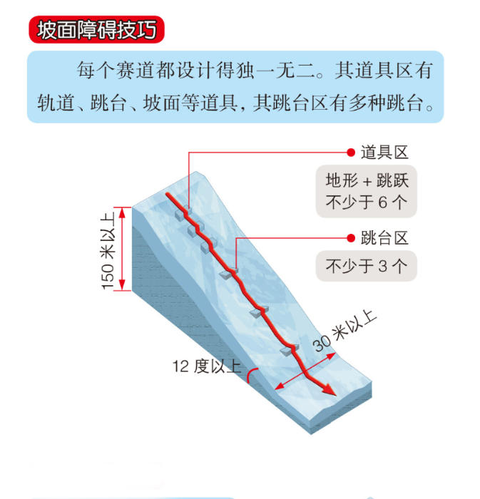 坡面障礙技巧場(chǎng)地由一系列障礙、跳臺(tái)、桿、平臺(tái)等構(gòu)成,場(chǎng)地賽道落差最少為150米,平均坡度在12度以上。
