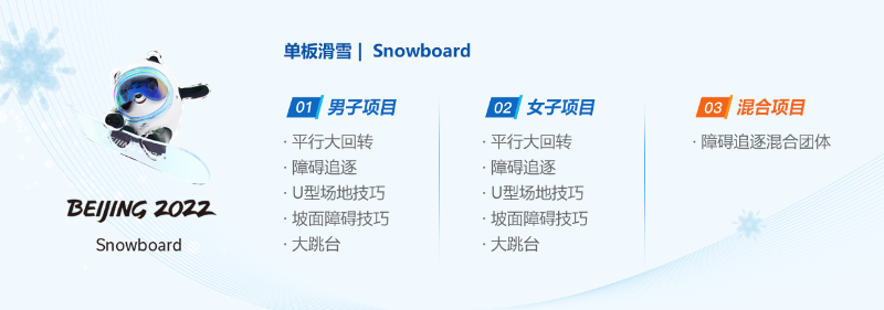 北京2022年冬奧會(huì)共設(shè)有男女U型場(chǎng)地技巧、坡面障礙技巧、平行大回轉(zhuǎn)、大跳臺(tái)和障礙追逐等項(xiàng)目,一共產(chǎn)生11枚金牌,其中障礙追逐混合團(tuán)體比賽是北京冬奧會(huì)新增小項(xiàng)。