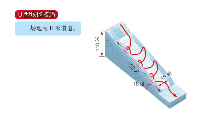 U型場(chǎng)地技巧比賽在一個(gè)U型雪槽中進(jìn)行,雪槽的長(zhǎng)度為150-170米,寬度為19-22米,深度為6.7米,坡度為17-18度。