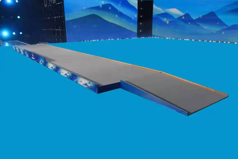 外觀顏色采用“天霽藍”加“Beijing 2022”印鑒字樣,適用于冬奧會和冬殘奧會。大臺外罩材料為高彈透氣針織面料,兩種型號的臺子都進行了配重設計,充分考慮了室外場館強風環(huán)境下的安全性。