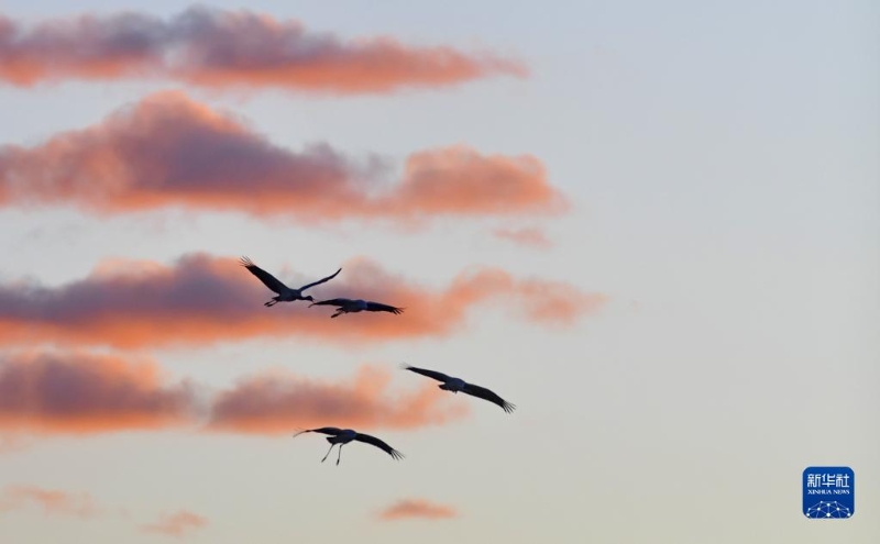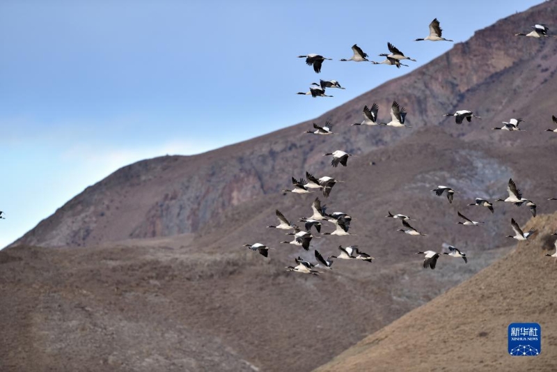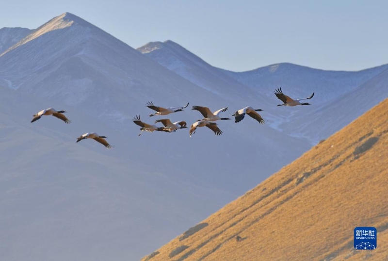 黑頸鶴在拉薩市林周縣上空飛翔(1月9日攝)?! ?/p>