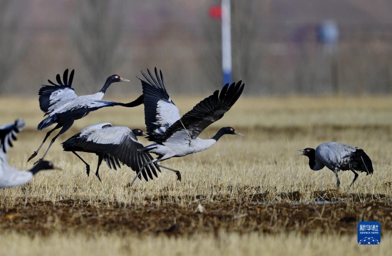 黑頸鶴在拉薩市林周縣農(nóng)田里起舞(1月8日攝)?! ?/p>