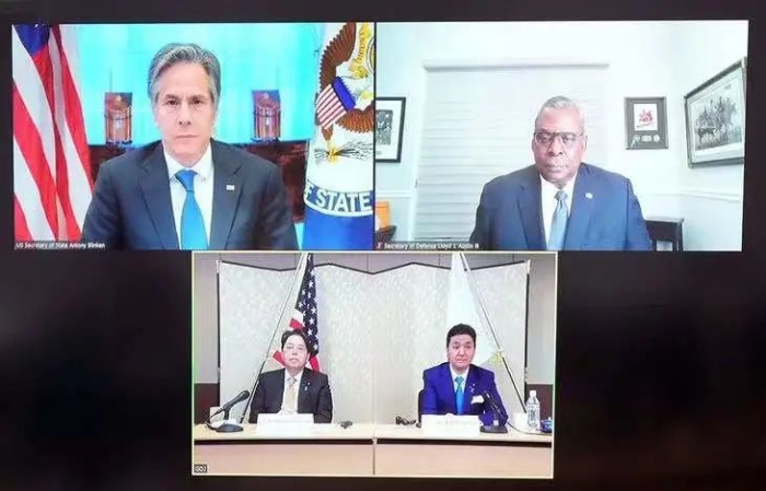 據(jù)日本《讀賣新聞》7日?qǐng)?bào)道,這是岸田文雄就任日本首相以來首次日美“2+2”會(huì)談,美國國務(wù)卿布林肯、國防部長奧斯汀,日本外相林芳正、防相岸信夫參會(huì)。會(huì)談剛開始,布林肯便聲稱:“中國、俄羅斯在陸海、宇宙和網(wǎng)絡(luò)方面的舉動(dòng)違反國際準(zhǔn)則。中國的挑釁行為,持續(xù)加劇臺(tái)灣海峽、東海、南海的緊張局勢(shì)?!眾W斯汀則聲稱,“印太地區(qū)”的緊張態(tài)勢(shì)正在加劇,該地區(qū)的自由、穩(wěn)定、安全受到中國和朝鮮挑戰(zhàn)。