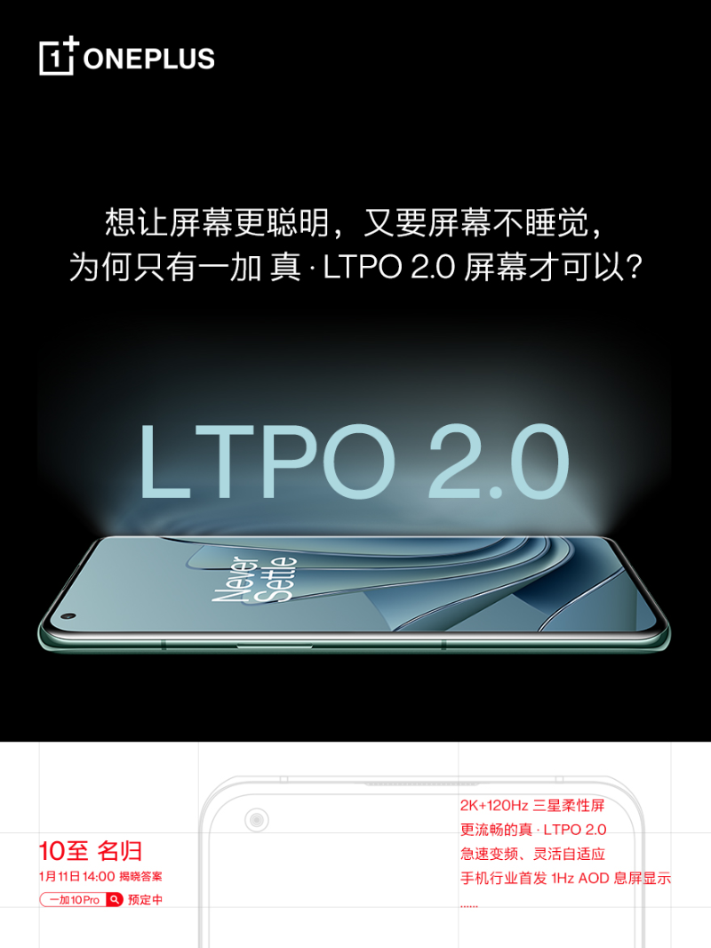 屏幕方面,一加持續(xù)創(chuàng)新不斷突破。一加 7 Pro曾開啟行業(yè)高幀屏?xí)r代;去年發(fā)布的一加 9 Pro采用的LTPO自由高幀屏幕再開行業(yè)先河。今年,一加 10 Pro將采用2K+120Hz三星柔性屏幕,搭載更為聰明的LTPO 2.0技術(shù),并且在手機行業(yè)首發(fā) 1Hz AOD息屏顯示,為用戶帶來更非凡的高幀體驗。