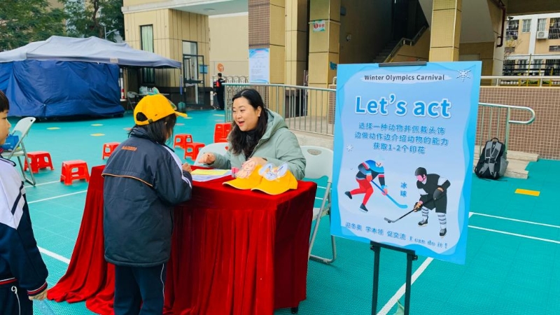 廣州市海珠外國(guó)語(yǔ)實(shí)驗(yàn)中學(xué)附屬小學(xué)為一年級(jí)學(xué)生舉辦“冰雪奧運(yùn)英語(yǔ)嘉年華”。(受訪者 供圖)