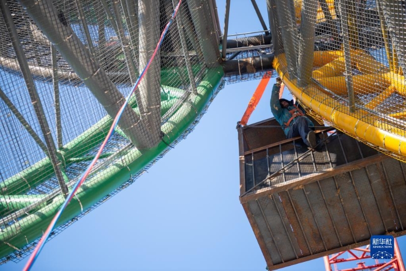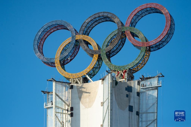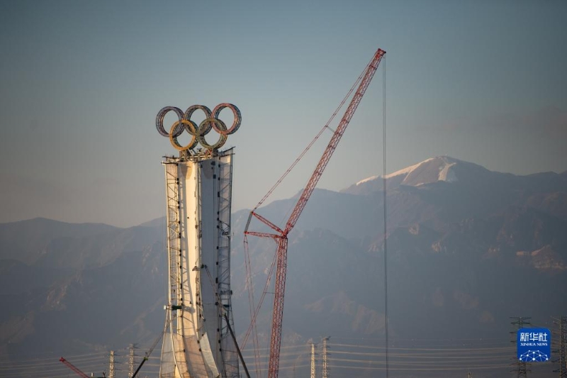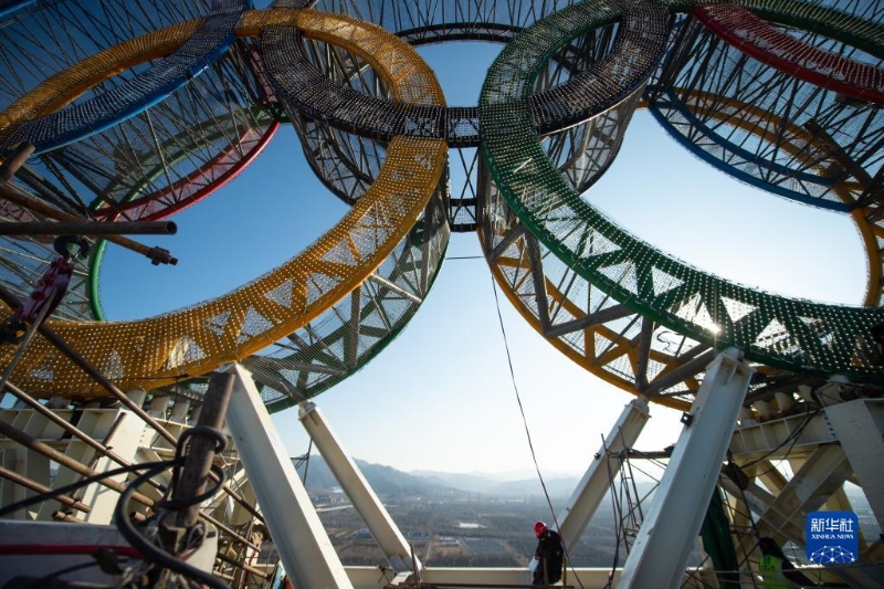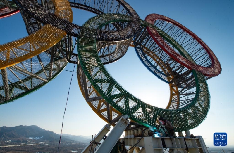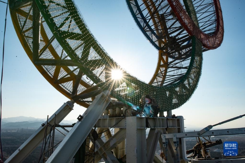 近日,位于北京冬奧會延慶賽區(qū)的“海陀塔”上的奧運五環(huán)結構吊裝作業(yè)完成,進入工程收尾階段。塔頂設置奧運五環(huán)標志,表面安裝了共計7萬余個白色點光源,塔身加裝飄帶形裝飾。