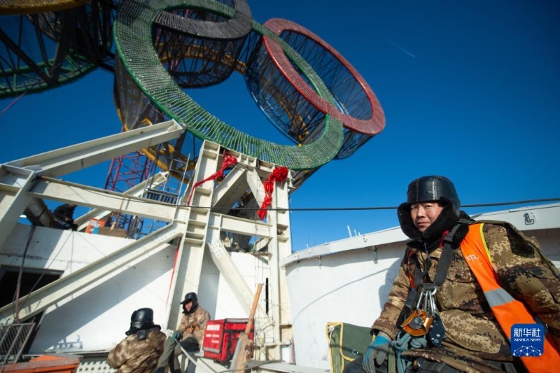 1月11日,工人們在“海陀塔”塔頂的奧運五環(huán)標志下作業(yè)。