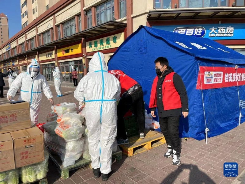 天津市津南區(qū)物美超市工作人員準備為封控區(qū)、管控區(qū)內(nèi)的居民運送生活物資(資料照片)。新華社發(fā)