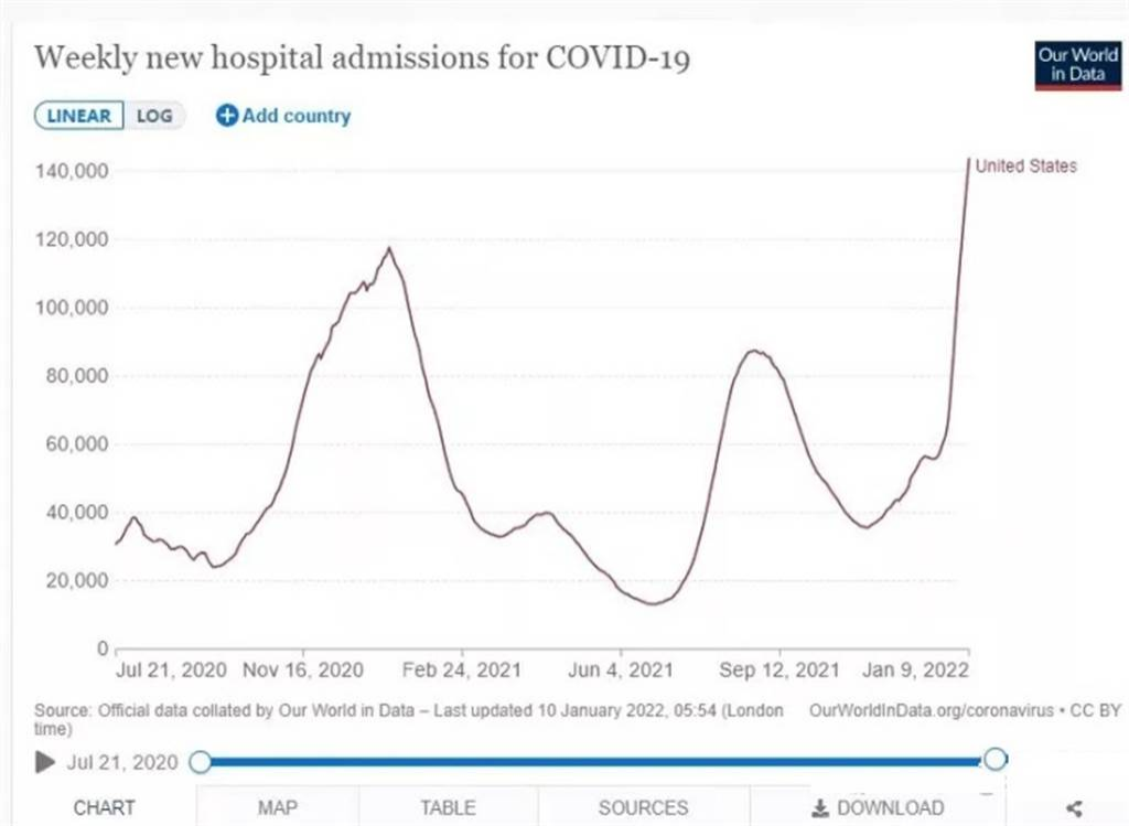 若以疫情嚴(yán)重的美國(guó)為例,在“奧密克戎”流行之前新增住院人數(shù)最高峰出現(xiàn)在2021年的1月中旬,當(dāng)時(shí)7日平均確診人數(shù)約26萬(wàn)人,7日平均住院人數(shù)近12萬(wàn)人。而“奧密克戎”疫情擴(kuò)散后的2022年1月中旬,因?yàn)榇_診人數(shù)暴增至70萬(wàn)人(7日平均),住院人數(shù)已超過(guò)14萬(wàn)人(7日平均),并持續(xù)創(chuàng)下疫情以來(lái)的住院人數(shù)新高。這能明顯看出“奧密克戎”對(duì)美國(guó)醫(yī)療體系造成的負(fù)荷已較“德爾塔”更重,勢(shì)必也會(huì)擠占其他病癥的醫(yī)療資源,如果按此趨勢(shì),未來(lái)“奧密克戎”重癥患者與死亡人數(shù)都會(huì)一一超越先前毒株。