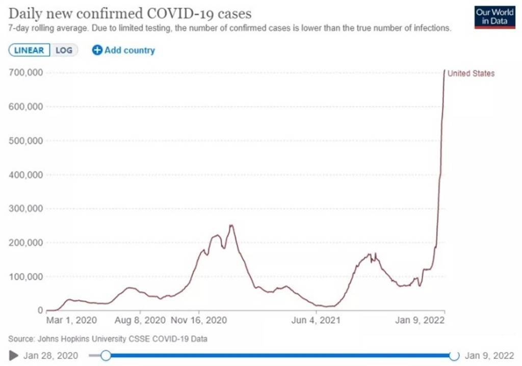 圖為美國(guó)疫情下確診人數(shù)曲線圖。在“奧密克戎”流行之前新增確診人數(shù)最高峰出現(xiàn)在2021年的1月中旬,7日平均確診人數(shù)約26萬(wàn)人,“奧密克戎”擴(kuò)散后則在2022年1月中旬的7日平均確診人數(shù)達(dá)到70萬(wàn)人。(圖/ourworldindata)