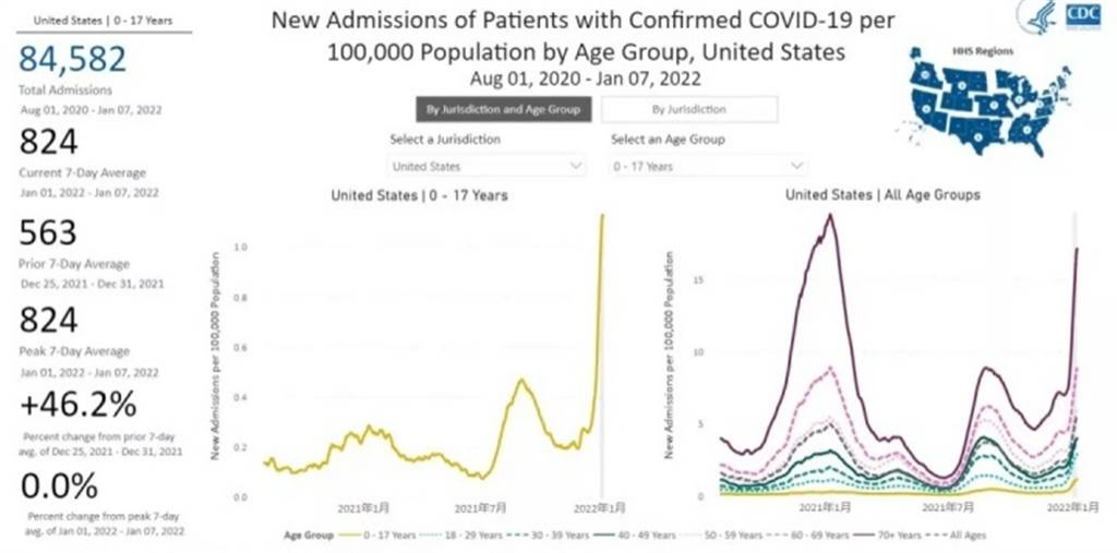 從美國(guó)確診與住院年齡層分析圖表可以發(fā)現(xiàn),這波“奧密克戎”的特點(diǎn)是幼童與青少年感染與住院的人數(shù)快增加。(圖/美國(guó)CDC)