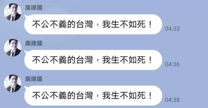 11日凌晨,龐建國在社交軟件群組中連發(fā)12字訊息:“不公不義的臺灣,我生不如死!”