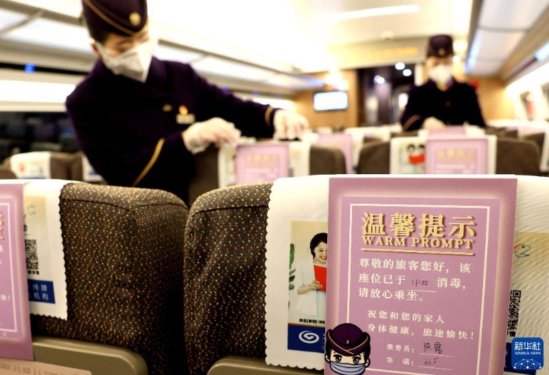 1月16日,乘務(wù)員在上海虹橋開往漢口的G1724次列車上布置消毒提示卡。