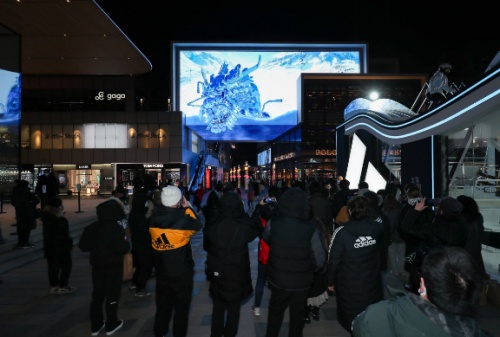 2022年1月16日晚19點,隨著 “滴—滴—滴” 的倒計時聲,全場的聚光燈打向3D巨幕。在滿屏雪花落下的背景中,一名滑手沖出雪霧,從山頂飛馳而下。他靈動的身形和精湛的技術,在這條雪道上濺起片片雪花。在他的身后不斷有人跟著滑下,有坐著雪橇的小朋友,滑著單板帥氣的男生,和玩轉雙板的女生。冰雪愛好者們不分年齡的熱愛,讓冰雪運動正在成為一種潮流和趨勢。大家漸漸匯聚成一隊,在擁有裸眼3D技術的屏幕向觀眾迎面飛來。飛濺的雪花跟著隊伍沖下來,揚起的雪霧愈來越濃,第一位專業(yè)滑手突然飛身向前,在單板揚起的雪蓋滿屏幕之際,一條雪龍瞬間沖出,突破屏幕展示 “集結雪上” 的號召 。巨龍沖出屏幕時強烈的視覺沖擊,讓現場的眾多行人駐足觀賞。