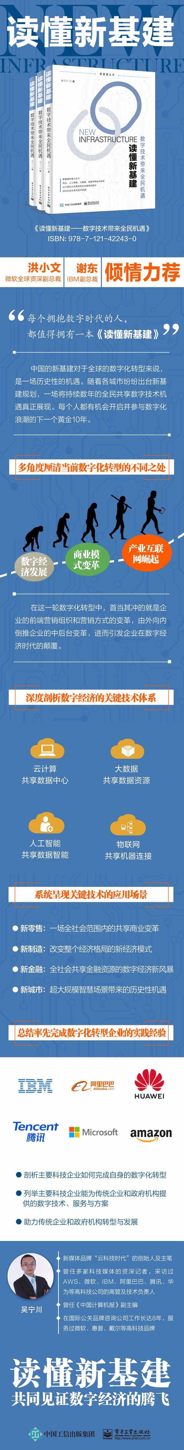 由國內(nèi)知名科技新媒體人、資深品牌戰(zhàn)略與營銷專家、科技行業(yè)長期觀察家吳寧川所著,微軟全球資深副總裁、微軟亞太研發(fā)集團主席洪小文以及IBM副總裁、大中華區(qū)首席技術(shù)官謝東推薦的《讀懂新基建:數(shù)字技術(shù)帶來的全民機遇》一書,于2022年1月正式上市?!蹲x懂新基建:數(shù)字技術(shù)帶來的全民機遇》一書由電子工業(yè)出版社出版發(fā)行,是電子工業(yè)出版社“新基建”叢書在2022年開年的重磅之作。