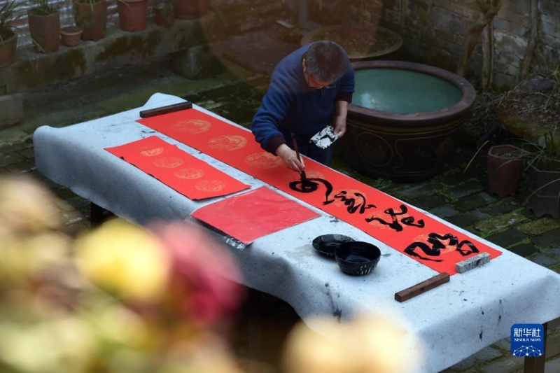 黃山市徽州區(qū)西溪南鎮(zhèn)的居民在寫(xiě)春聯(lián)(1月19日攝)。