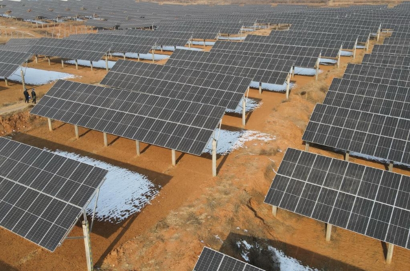 1月5日,電力工人在石家莊市靈壽縣北譚莊鄉(xiāng)北陽(yáng)溝村附近的光伏電站巡查(無人機(jī)照片)。新華社記者 楊世堯 攝
