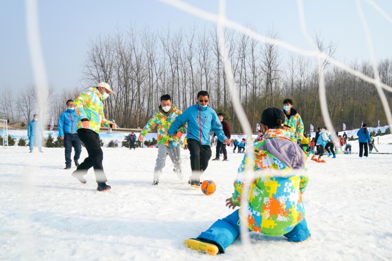 1月18日,冰雪愛好者們?cè)谶M(jìn)行雪地足球比賽。當(dāng)日,一場(chǎng)以“歡樂迎冬奧”為主題的雪地趣味運(yùn)動(dòng)會(huì)在江蘇省淮安市盱眙縣鐵山寺滑雪場(chǎng)舉行,百余名冰雪愛好者參加了雪地拔河、雪地競(jìng)速、雪地足球等項(xiàng)目的比賽,感受冰雪運(yùn)動(dòng)帶來的樂趣。新華社記者 李博 攝