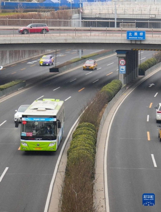 1月21日,冬奧服務(wù)車輛行駛在德勝門外大街的奧林匹克專用車道上。