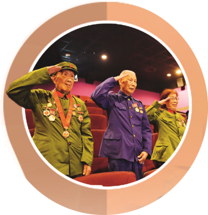五里墩街道組織老兵觀看電影《長(zhǎng)津湖》,電影結(jié)束后,老兵起立敬禮。