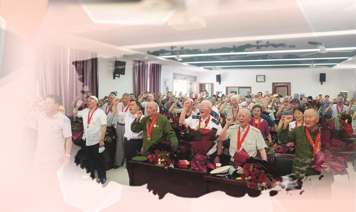 “光榮在黨50年”紀(jì)念章頒發(fā)儀式現(xiàn)場(chǎng),老黨員重溫入黨誓詞。