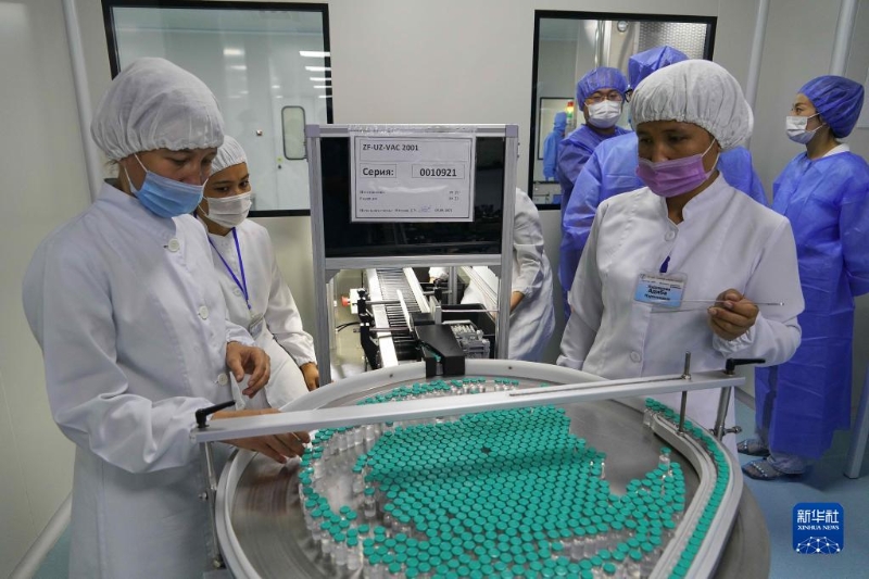 2021年9月5日,在烏茲別克斯坦制藥企業(yè)祖拉貝克實(shí)驗(yàn)室有限公司,工作人員在新冠重組蛋白疫苗生產(chǎn)線上工作。由中國(guó)科學(xué)院微生物研究所和安徽智飛龍科馬生物制藥有限公司共同研發(fā)的新冠重組蛋白疫苗在烏茲別克斯坦制藥企業(yè)祖拉貝克實(shí)驗(yàn)室有限公司正式投產(chǎn),這是該國(guó)首次實(shí)現(xiàn)中國(guó)新冠疫苗本地化生產(chǎn),也是該款新冠重組蛋白疫苗的生產(chǎn)線首次在國(guó)外落地。新華社發(fā)(扎法爾攝)