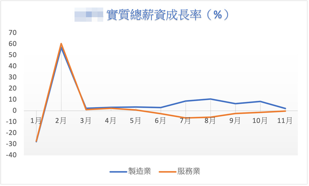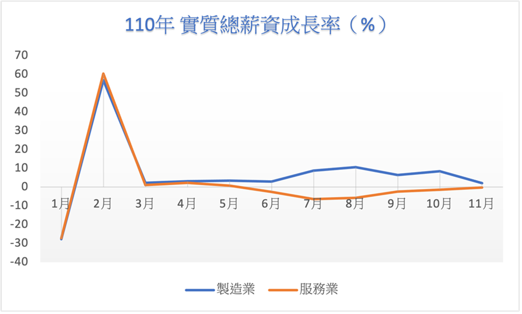 從2016年5月到2021年11月,在蔡英文任期中,臺灣的制造業(yè)實質(zhì)總薪資增加10.11%,而服務(wù)業(yè)實質(zhì)總薪資卻是負(fù)成長 -1.1%。這個現(xiàn)象在2021年的疫情更為嚴(yán)重,從表二可以看出,2021年4月疫情出現(xiàn)破口后,制造業(yè)、服務(wù)業(yè)的實質(zhì)總薪資成長率出現(xiàn)明顯的落差,服務(wù)業(yè)是屋漏偏逢連夜雨。