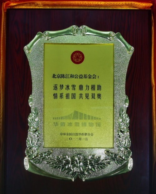 2022年1月20日,華僑冰雪博物館舉行落成儀式,由于疫情,陳江和雖然未能親自成行,但特意委托工作人員專程祝賀。萬立駿主席向北京陳江和公益基金會頒發(fā)了紀(jì)念獎牌。華僑冰雪博物館專門設(shè)立了金鷹廳。
