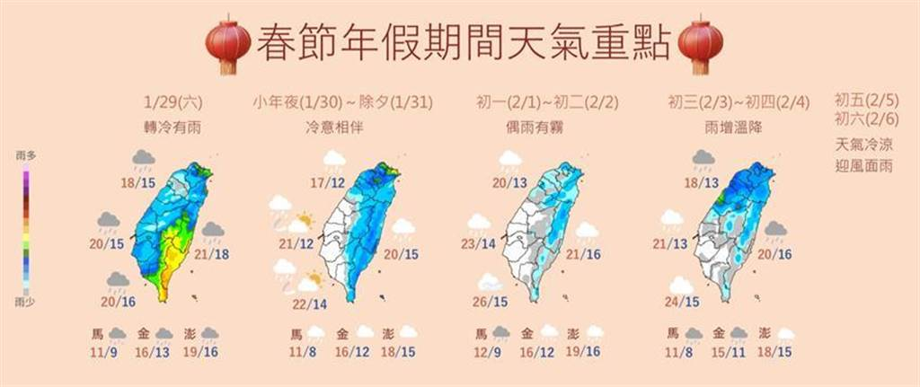 春節(jié)年假天氣重點(diǎn)。圖/臺(tái)氣象部門