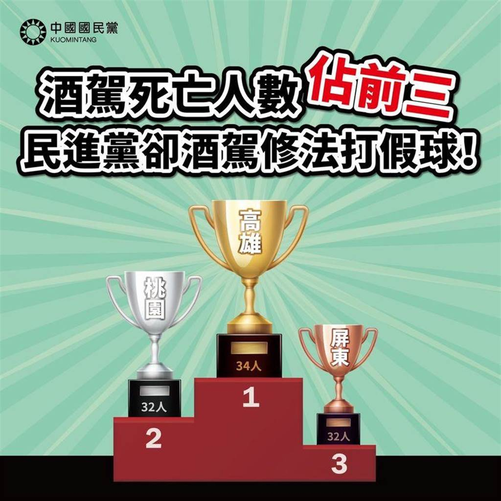 國民黨表示,其中,酒駕死亡人數(shù)最多的縣市是高雄市,竟多達(dá)34人,甚至較前一年同期增加了11人之多,是全臺(tái)最多,而桃園市、屏東縣等綠營執(zhí)政縣市的酒駕死亡人數(shù)也高達(dá)32人,與高雄名列全臺(tái)酒駕死亡人數(shù)最多的前3名。