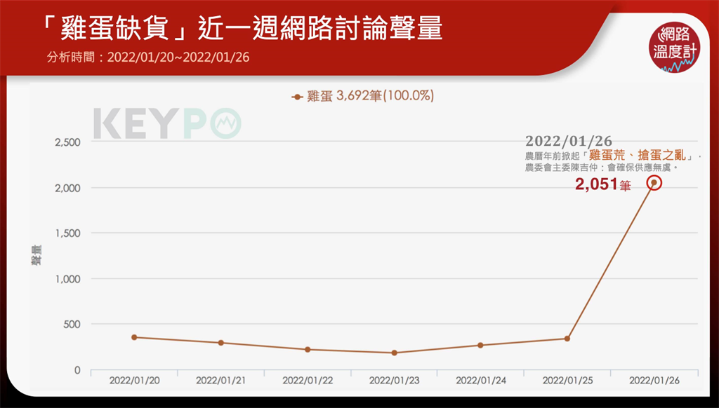 雞蛋話題持續(xù)發(fā)燒,透過《KEYPO大數(shù)據(jù)關(guān)鍵引擎》調(diào)查(2022/01/20~2022/01/26)統(tǒng)計(jì)調(diào)查,雞蛋荒話題熱度持續(xù)攀高,1月26日討論度一口氣沖到2051筆,網(wǎng)友話題聚焦在“蛋荒、蛋價(jià)、搶蛋”,從趨勢(shì)圖上可以清楚看見,越接近農(nóng)歷過年,雞蛋話題越趨明顯,26日沖上一波高峰。