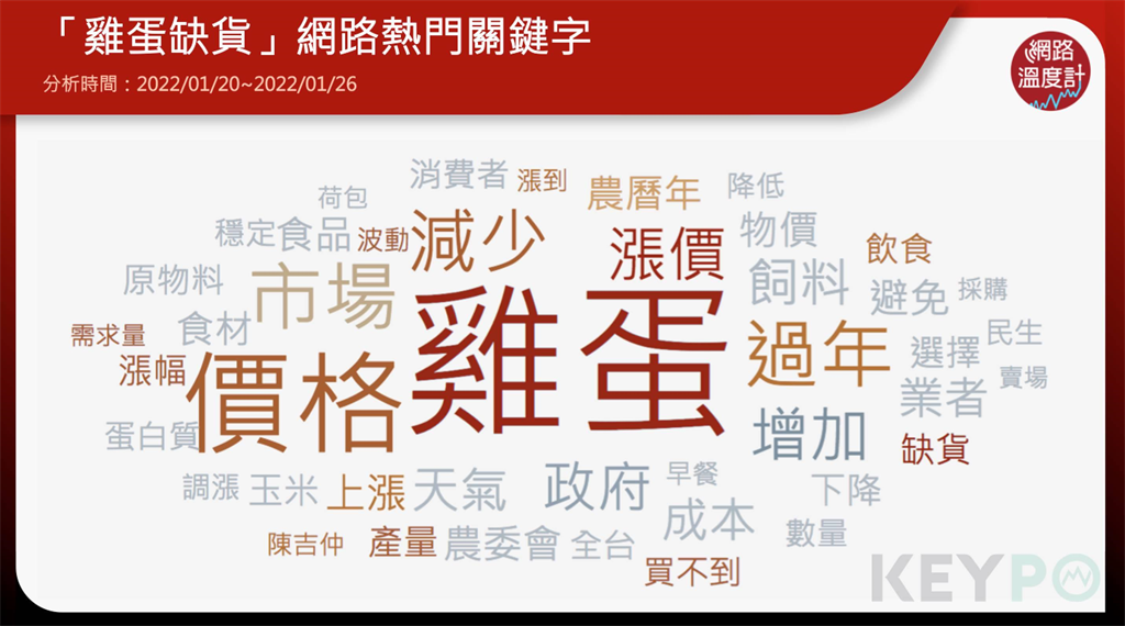 進(jìn)一步透過《KEYPO大數(shù)據(jù)關(guān)鍵引擎》分析,網(wǎng)友在這次的搶雞蛋議題上,最常提及的熱門關(guān)鍵詞,包括價(jià)格、漲價(jià)、買不到、缺貨等等,大多數(shù)的字詞都與實(shí)際狀況息息相關(guān)。