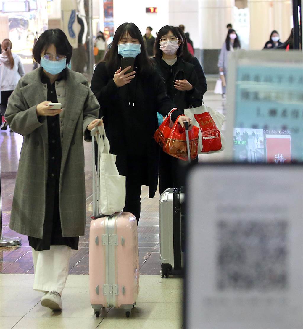 春節(jié)9天連假29日開始,28日最后一個年前工作日,在新北市板橋車站出現(xiàn)乘車返鄉(xiāng)人潮,大家拖著行李準(zhǔn)備回家團(tuán)圓過新年,在進(jìn)入月臺前也不忘做好實名制防疫。(趙雙杰攝)
