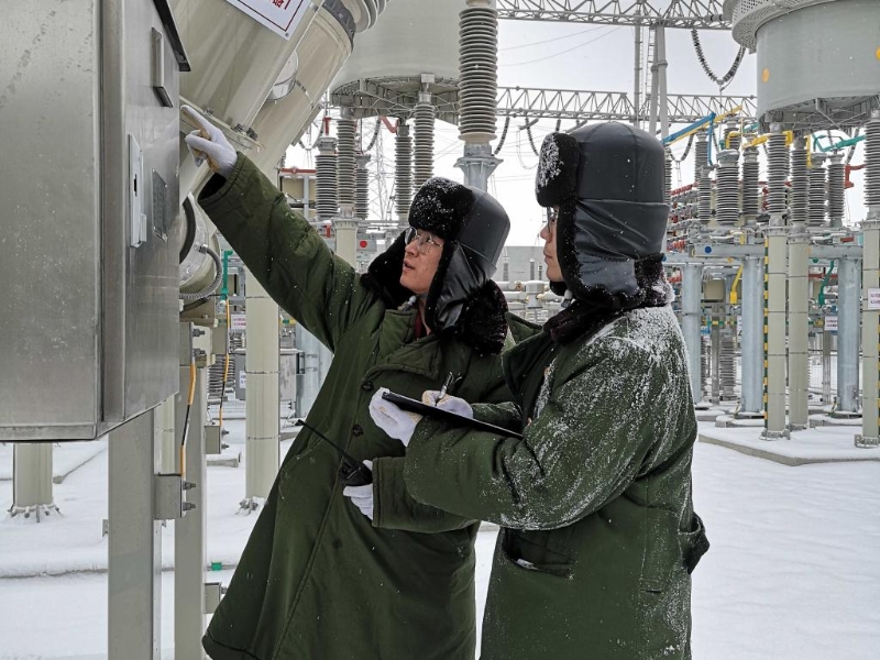 2022年1月28日,國(guó)網(wǎng)冀北北京超高壓公司運(yùn)維人員冒雪在中都換流站進(jìn)行冬奧保電巡視。呂越穎攝
