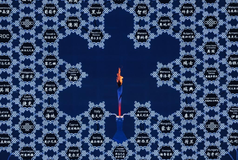 “屏幕中,AR(增強現(xiàn)實)雪花在地球的映襯下同步下落匯聚,象征人類命運共同體的大雪花遨游天際,最終飛回地屏中心。在萬眾矚目下,一個含有所有參賽國家和地區(qū)名稱、長約15米的雪花形火種裝置緩緩升起,浪漫純潔、熠熠生輝,閃耀‘鳥巢’中央、直擊觀眾內(nèi)心,象征全世界人民緊密團結(jié)在一起?!遍_幕式視效總監(jiān)王志鷗闡釋道,“特別是在疫情下舉辦的本屆冬奧會,這朵雪花講述的不僅是‘我’的故事,更是‘我們’共同的未來,凸顯人類命運共同體的重要意義,昭示全世界必須團結(jié)互助,才能戰(zhàn)勝困難。”