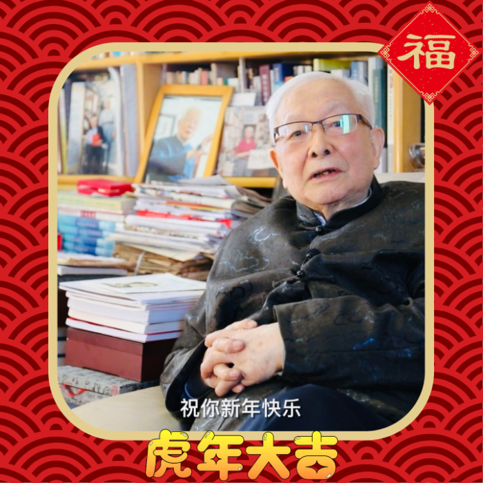 圖為96歲的大陸新聞學(xué)泰斗方漢奇向臺(tái)灣98歲的新聞學(xué)大家李瞻拜年的視頻截圖。