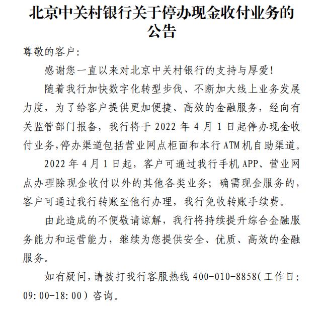 其中,遼寧振興銀行發(fā)布停辦柜面和ATM現(xiàn)金業(yè)務(wù)的公告,經(jīng)主管人民銀行批復(fù),從2022年3月1日起,停辦柜面現(xiàn)金存取款、零錢兌換、殘損幣兌換、ATM存取款等現(xiàn)金業(yè)務(wù)。北京中關(guān)村銀行發(fā)布關(guān)于停辦現(xiàn)金收付業(yè)務(wù)的公告,經(jīng)向有關(guān)監(jiān)管部門報備,將于2022年4月1日起停辦現(xiàn)金收付業(yè)務(wù)。