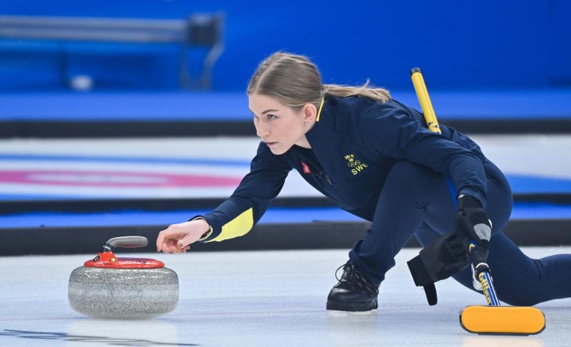 2月8日,瑞典隊選手阿爾米達(dá)·德瓦爾在北京2022年冬奧會冰壺混雙銅牌賽中。新華社記者黃孝邦攝
