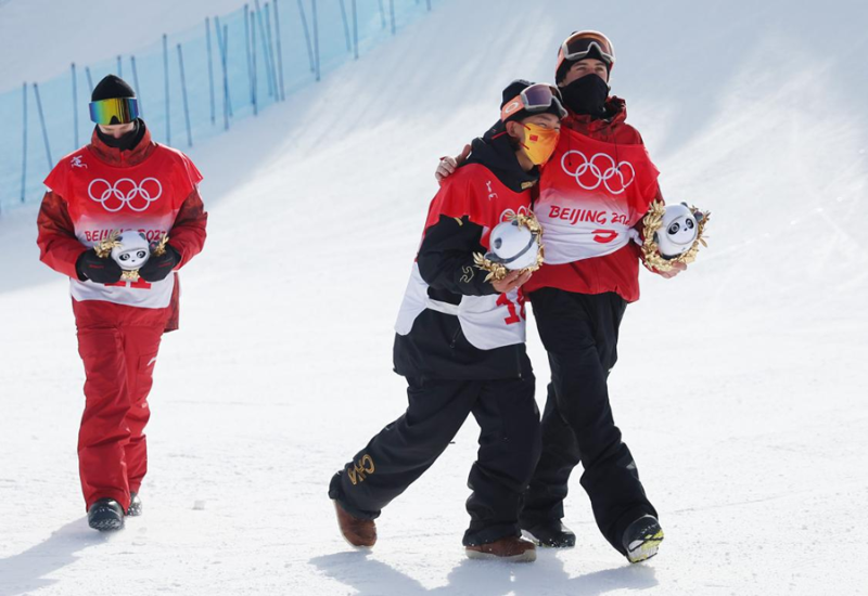 中國選手蘇翊鳴(中)和獲得季軍的加拿大選手馬克·麥克莫里斯(右)在頒花儀式后擁抱。 來源:視覺中國