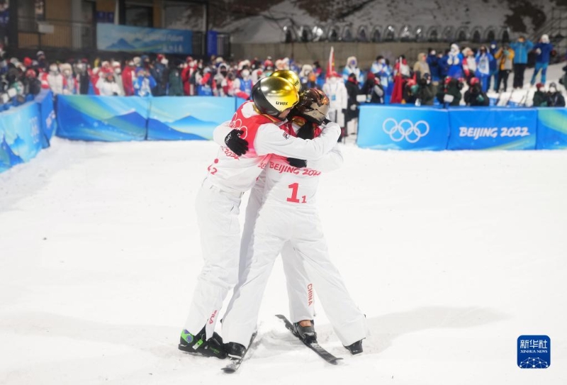 2月10日,中國隊(duì)選手徐夢桃與賈宗洋(右)賽后擁抱。