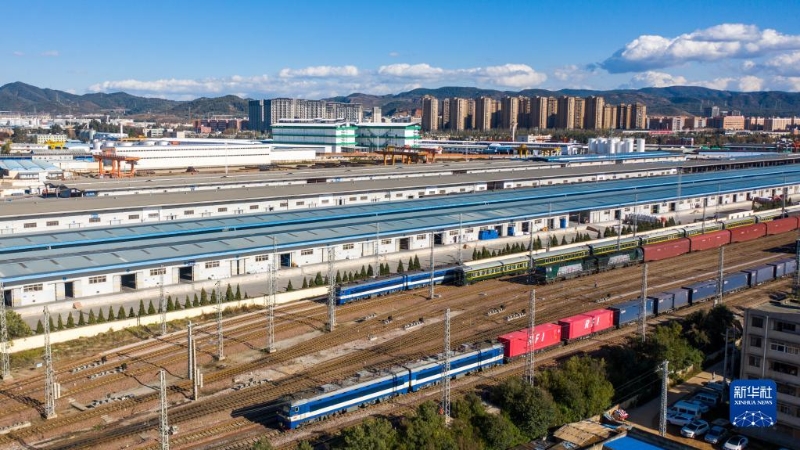 1月1日,滿載30個(gè)標(biāo)準(zhǔn)集裝箱的中老鐵路新年首趟國際貨物列車(前)從昆明開往老撾萬象(無人機(jī)照片)。新華社記者 胡超 攝