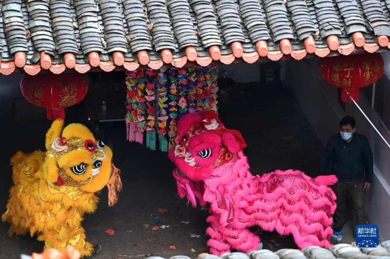 2月13日,在廣西柳州市柳江區(qū)進德鎮(zhèn)四連村,人們在表演舞獅。
