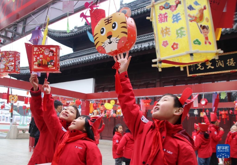 2月13日,江蘇省蘇州市平江實驗學(xué)校學(xué)生在校園內(nèi)猜燈謎、賞花燈。
