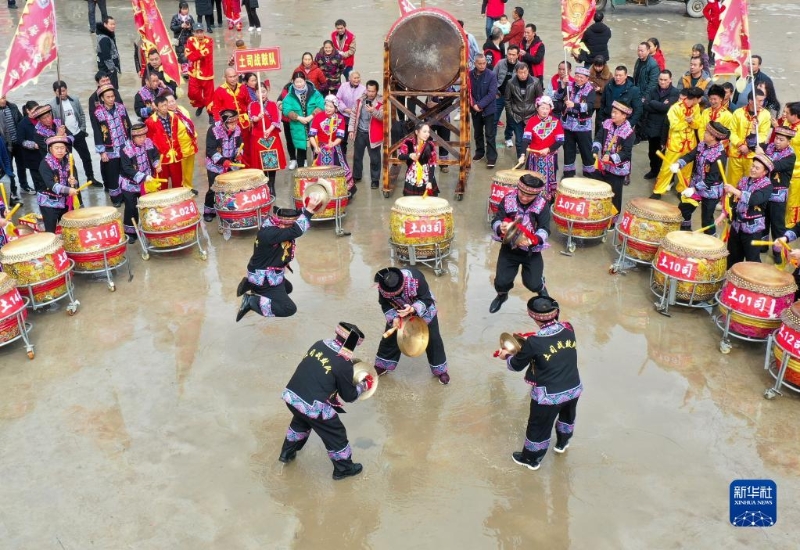 2月13日,民間藝人在貴州省岑鞏縣注溪鎮(zhèn)周坪村表演“思州戰(zhàn)鼓”(無人機照片)。
