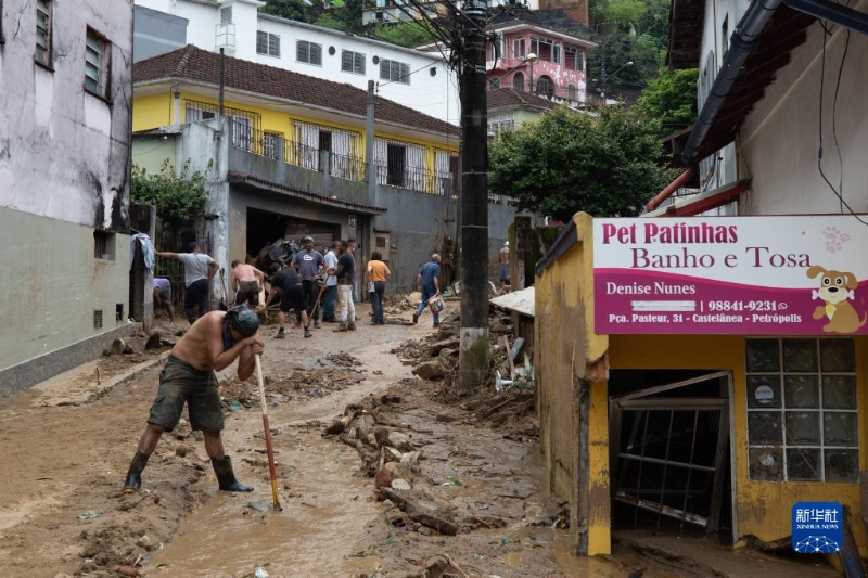 2月16日,人們在巴西里約熱內盧州彼得羅波利斯市的街道上清理淤泥。