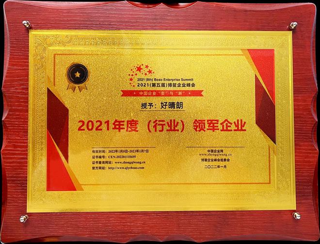 2022年1月9日,第五屆博鰲企業(yè)論壇暨2021亞洲經(jīng)濟大會在海南博鰲隆重舉行,圍繞“中國企業(yè)‘變’與‘新’”的論壇主題,部委領(lǐng)導(dǎo)、專家學(xué)者、各行業(yè)企業(yè)家代表匯聚一堂,共同交流探討如何把握新機遇,應(yīng)對新挑戰(zhàn),奮進新征程。好晴朗憑借深厚的資源整合能力與多年早托領(lǐng)域的實踐經(jīng)驗,榮獲2021年度行業(yè)領(lǐng)軍企業(yè)獎。