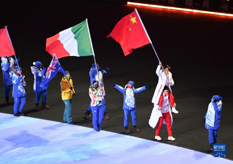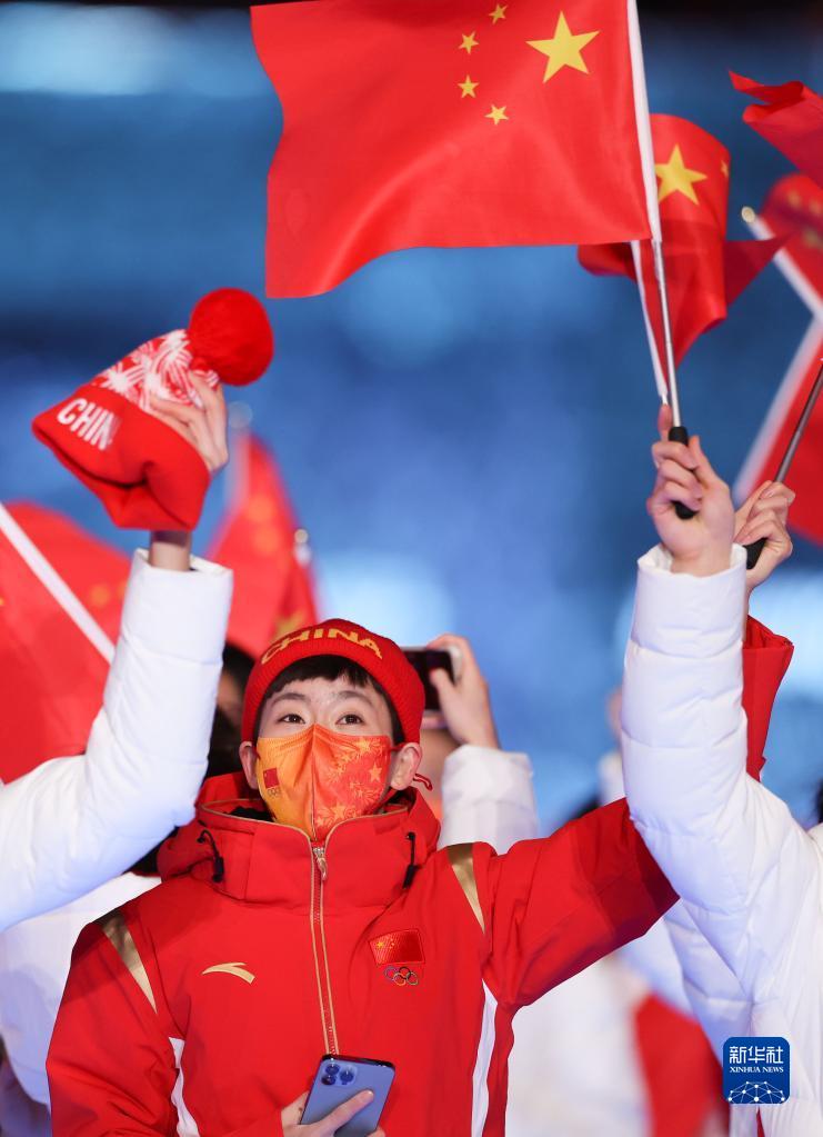 這是中國代表團(tuán)旗手徐夢桃與高亭宇在閉幕式上入場。